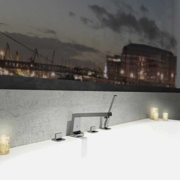 240 2400 4-HOLE DECK MOUNTED BATH MIXER projection 200 mm, with 90° ceramic headparts, intrinsically safe against backflow, with diverter and pull-up handshower, flex hoses between deck-valve and angle valve not included, chrome